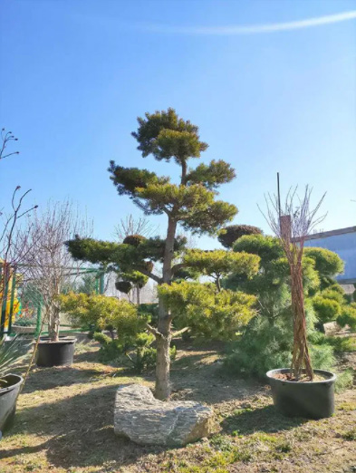 Piękna formowana Sosna Banksa. Styl bonsai nadaje uroku oraz prestiżu zarówno w ogrodzie jak i przy firmie.